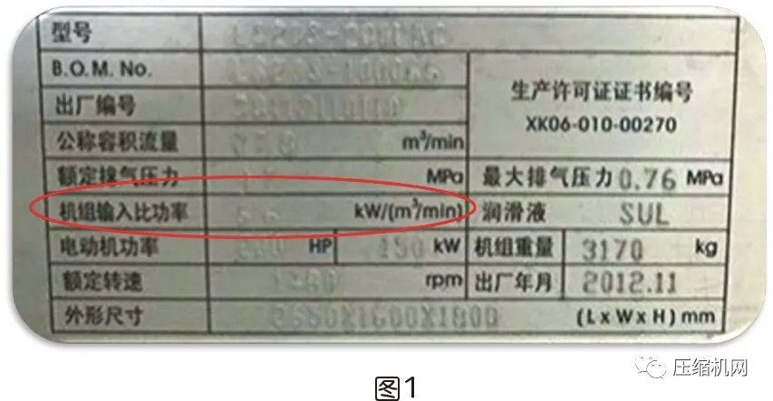 “比功率”是我們空壓機(jī)銷售人員通常的銷售俗語(yǔ),如果在正式的標(biāo)書和空壓機(jī)驗(yàn)收單(或機(jī)器銘牌)上應(yīng)該用標(biāo)準(zhǔn)的術(shù)語(yǔ):“機(jī)組輸入比功率”,簡(jiǎn)稱:SER。(見(jiàn)圖1)