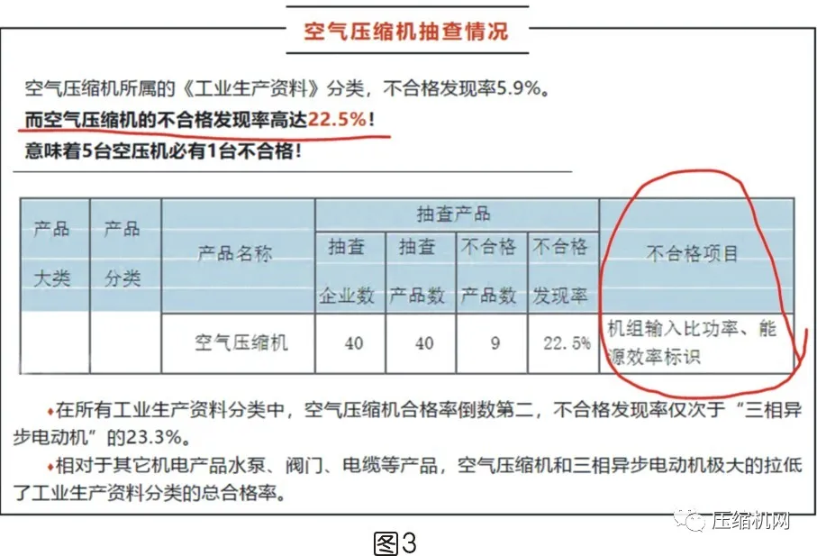 空壓機(jī)的“機(jī)組輸入比功率”值是國(guó)家重點(diǎn)工業(yè)產(chǎn)品質(zhì)量安全監(jiān)管內(nèi)容,屬于國(guó)家強(qiáng)制標(biāo)準(zhǔn)和監(jiān)督的范疇(見(jiàn)圖3)。在空壓機(jī)市場(chǎng)中,無(wú)論是標(biāo)書、合同、樣本及機(jī)器銘牌,都必須標(biāo)注“機(jī)組輸入比功率”值且需達(dá)到標(biāo)準(zhǔn)值。