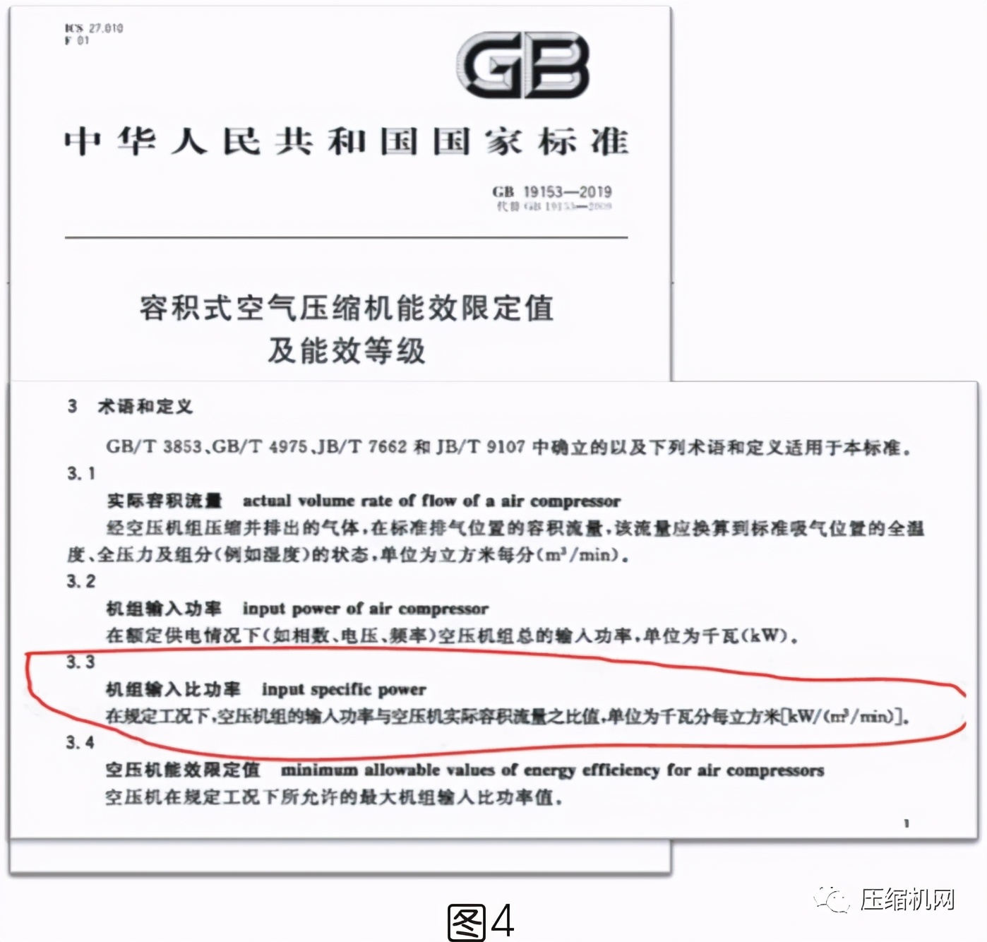 在GB19153-2019 《容積式壓縮機(jī)能效限定值及能效等級(jí)》規(guī)范了“機(jī)組輸入比功率”這個(gè)術(shù)語(yǔ)。(圖4)